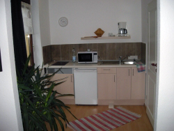 The equipped kitchenette and bathroom with shower and toilet are used by both rooms.
