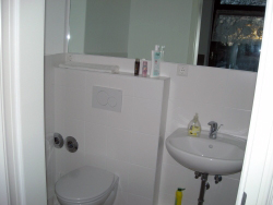 The equipped kitchenette and bathroom with shower and toilet are used by both rooms.